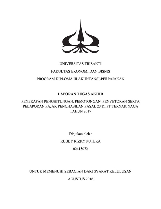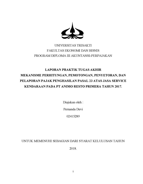 P Pajak merupakan kontribusi wajib kepada negara yang terutang oleh orang pribadi atau badan yang bersifat memaksa berdasarkan Undang-Undang, dengan tidak mendapatkan imbalan secara langsung dan digunakan untuk keperluan negara bagi sebesar-besarnya kemakmuran rakyat. Selama pelaksanaan Praktek Kerja Lapangan yang dilakukan oleh penulis pada PT. Surya Bumi Tunggal Perkasa, dimana PT. Surya Bumi Tunggal Perkasa telah melakukan pemotongan, penyetoran, pelaporan dan pencatatan Pajak Penghasilan Pasal 23atas jasa secara rutin dan sesuai dengan peraturan dan undang-undang perpajakan yang berlaku. Adapun Penulis juga melakukan beberapa metode penyusunan Tugas Akhir yaitu metode observasi, metode tanya jawab, dan metode riset kepustakaan. Penghitungan Pajak Penghasilan Pasal 23 atas Jasa yang dilakukan oleh PT. Surya Bumi Tunggal Perkasa harus sesuai dengan UU Nomor 36 Tahun 2008 dan mekanisme pemotongan, penyetoran, pelaporandan pencatatannya juga harus sesuai dengan PMK Nomor 80/PMK.03/2010. Tujuan penulisan Laporan Tugas Akhir ini untuk mengetahui apakah tinjauan atas pemotongan, penyetoran, pelaporan dan pencatatn Pajak Penghasilan Pasal 23 atas Jasa pada PT. Surya Bumi Tunggal Perkasa untuk masa pajak November tahun 2016 sampai dengan masa pajak Maret tahun 2016, telah sesuai dengan peraturan dan undang-undang perpajakan yang berlaku.