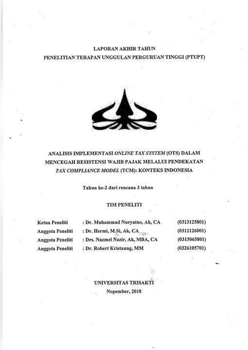 LAPORAN PENELITIAN Analisis implementasi online tax system (OTS) dalam mencegah resistensi wajib pajak melalui pendekatan tax compliance model (TCM) : konteks Indonesia : tahun ke 2 dari rencana 3 tahun Oleh : Muhammad Nuryanto, Hermi, Nazmel Nazir, Robert Kristaung Subyek : TaxationAbstraksi : Penelitian ini bertujuan untuk: (1) Mendapatkan bukti empirik dan deskripsi tentang efektivitas pemahaman wajib pajak… Lemlit - Usakti, 2018
